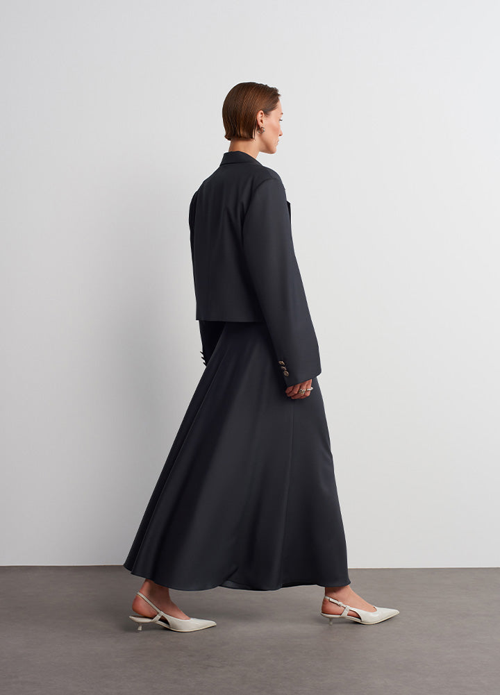 %100 yün kullanılarak üretilen bu crop blazer, İtalyan kumaşının zarif dokusu ve hafif parlak yüzeyiyle modern bir şıklık sunuyor. Metal düğme detayları, blazerın tasarımına sofistike bir aksesuar görünümü kazandırırken, kısa kesimiyle cesur ve çarpıcı bir siluet yaratır. Yumuşacık dokusu ve sık yapısı, hem dayanıklılığı hem de konforu bir araya getirir. Uzun elbiselerden geniş kesim pantolonlara kadar farklı parçalarla mükemmel bir şekilde kombinlenebilen bu blazer, zamansız ve stil sahibi bir görünüm arayanlar için ideal bir seçim.