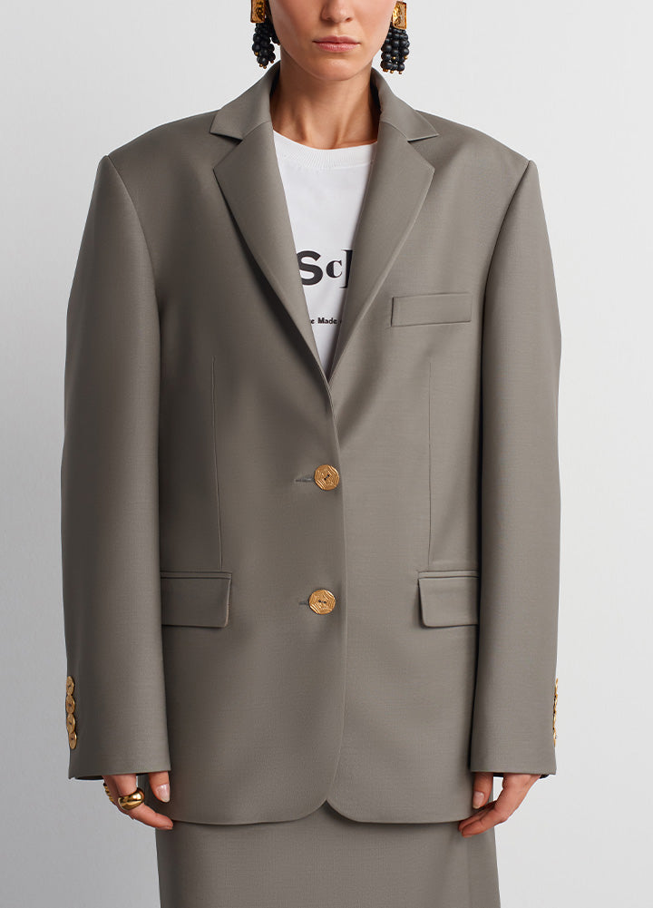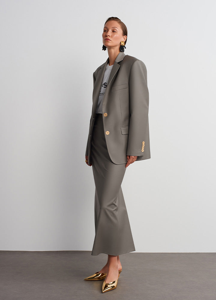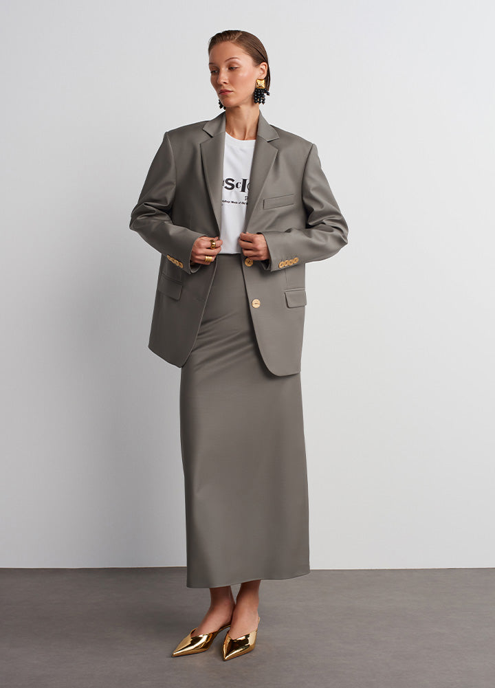 Introducing our upcycled wool blended blazer and matching skirt are both fashioned from a blend of luxurious composition and stretch fibers, exudes comfort and durability with a modern, relaxed fit that complements various body types. Its design not only prioritizes style but also underscores our commitment to sustainability through the use of upcycled fabrics, reducing environmental impact while promoting ethical fashion choices. This versatile set effortlessly combines sophistication with eco-consciousness, offering a timeless addition to your wardrobe that embraces both comfort and conscientious style.