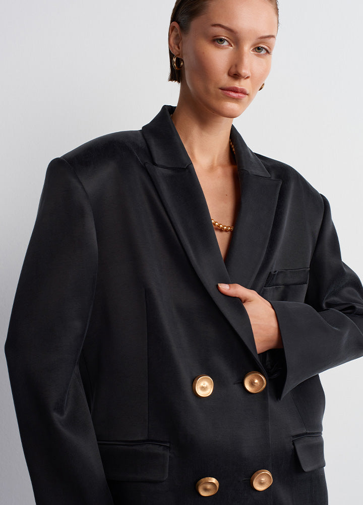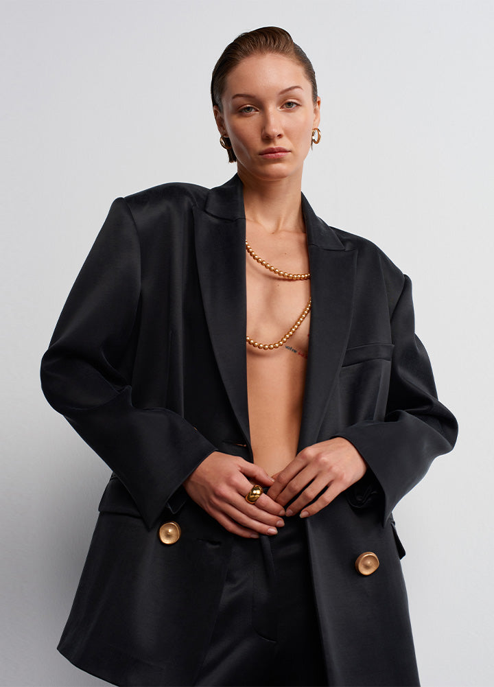 Sürdürülebilir modayı yeniden tanımlayan vegan ipek ve cupro kumaştan üretilmiş şık, oversize gece blazer'ımızı keşfedin. Pamuk lifi atıklarından elde edilen cupro ve ağaç hamurundan elde edilen viskon, doğal kökenlerini lüks dokuları ve dayanıklılıklarıyla vurguluyor. Bu kumaşlar, çevre dostu üretim yöntemlerini destekleyerek biyolojik olarak çözünebilirlik sağlar ve sentetik malzemelere olan bağımlılığı en aza indirir. Gardırobunuza şıklık katan bu parçayı tercih ederek daha temiz ve yeşil bir gelecek için bilinçli bir adım atın. Üstelik bu blazer'ı, aynı takımın yelek ve eteğiyle kombinleyebilirsiniz.