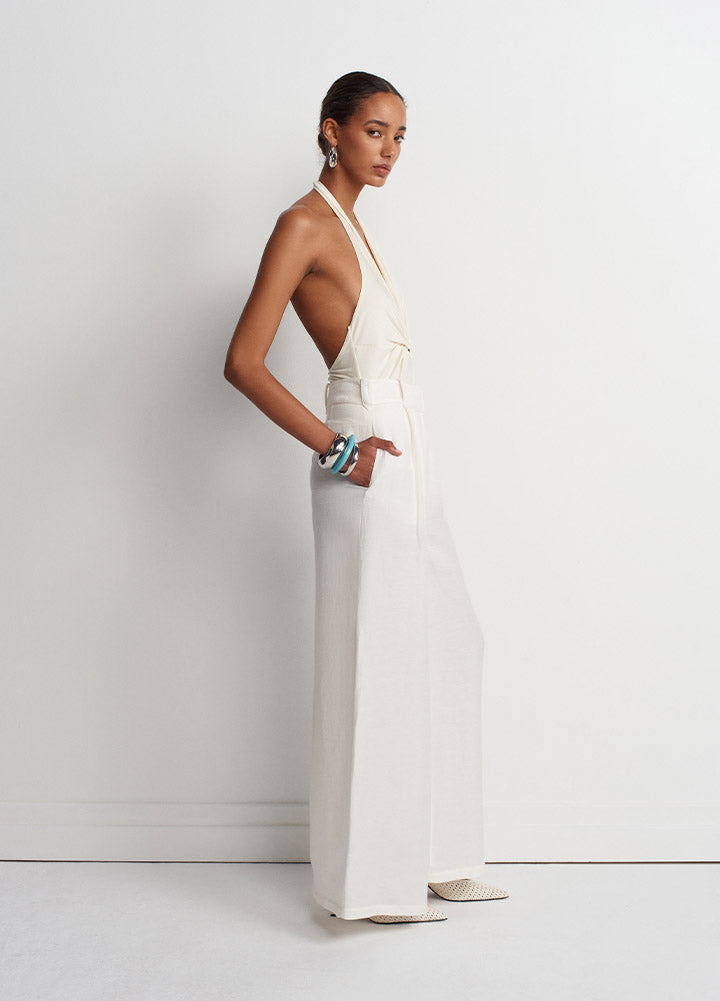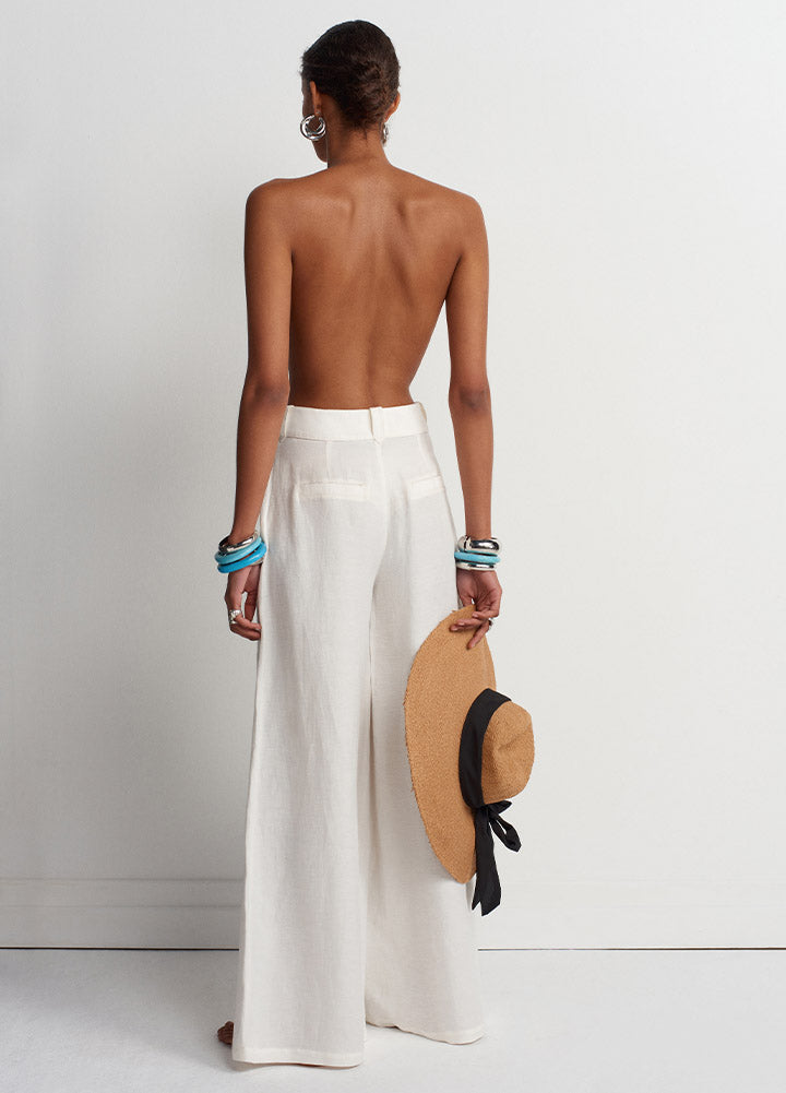 Keten ve vegan ipek (Cupro) karışımlı bu yüksek bel pantolon, hafifliği ve dökümlü yapısıyla sıcak günlerde ideal bir konfor sunar. Geniş paça kesimiyle silueti uzatırken, doğal dokusuyla hem gündüz kombinlerine ferah bir şıklık katar, hem de yaz akşamlarında sofistike bir duruş sağlar.