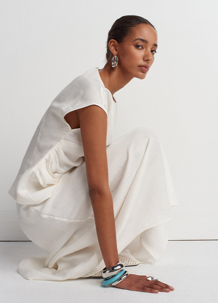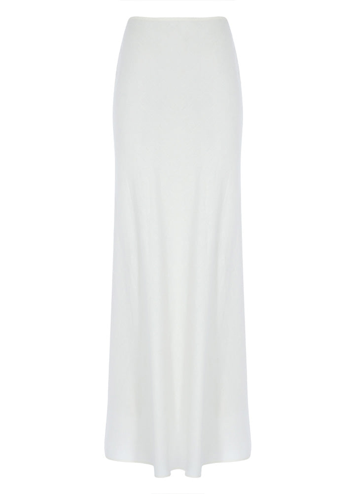 Cupro ve keten karışımından üretilen bu uzun etek, dökümlü yapısıyla hem hafiflik hem de rafine bir duruş sunar. Nefes alabilen doğal yapısı sayesinde sıcak günlerde ideal bir konfor sağlar; sade formu ise ister gündüz ister akşam kombinlerinde kolayca uyumlanır.