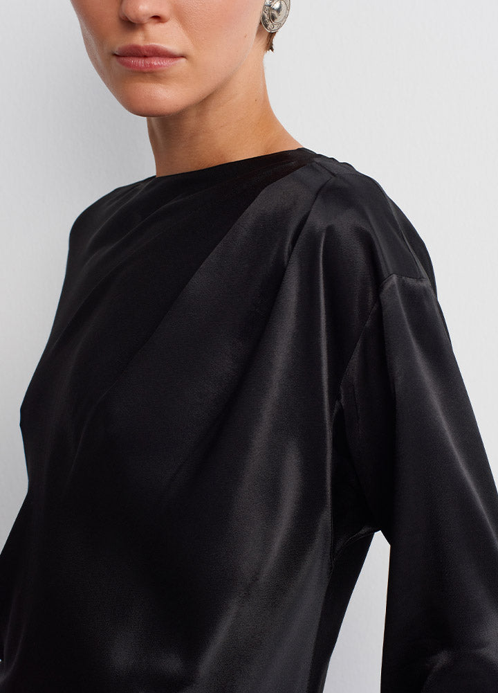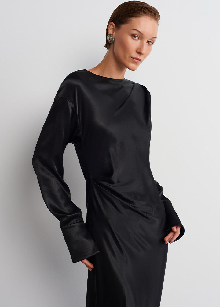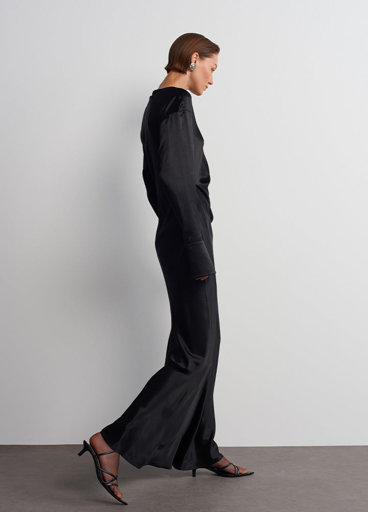 %55 Ecovero Viskon ve %45 Rayon karışımı kumaşla üretilen bu drapeli uzun gece elbisesi, hem şıklığı hem de çevre dostu özellikleriyle dikkat çekiyor. Ecovero Viskon, sürdürülebilir kaynaklardan elde edilen ve çevre dostu üretim yöntemleriyle işlenen bir kumaş türüdür. Rayonun yumuşaklığı ve doğal görünümüyle birleşen bu kumaş, elbiseye zarif bir döküm ve lüks bir his kazandırır. Bedene oturmayan tasarımı, ince bir siluet sunarak hem rahat hem de şık bir görünüm sağlar. Uzun kolları ve zarif drape detayları, elbiseye zarafet katarken, özel davetlerde stilinizi tamamlayacak mükemmel bir seçenek sunar.